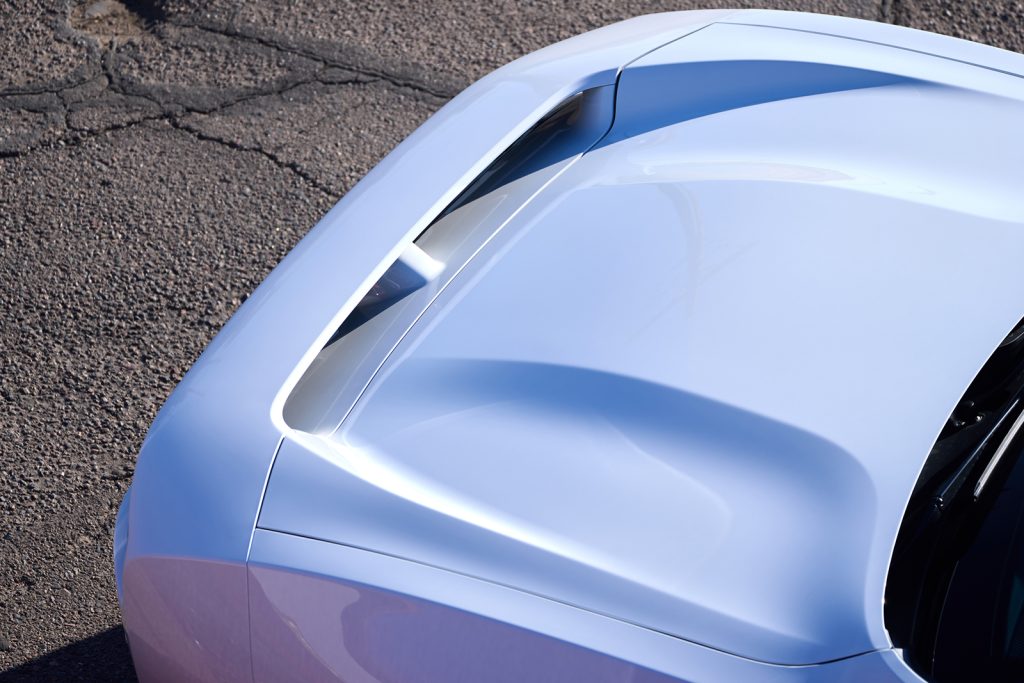 At the front, the patent-pending R-Wing aero pass-through serves as both form and function, minimizing drag at high speeds. This innovative feature pays homage to a legendary rocket scientist turned automotive aerodynamicist who revolutionized race car design.